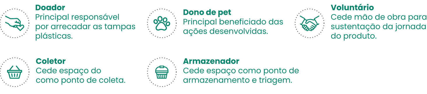Estes stakeholders têm um papel importante no projeto. O coletor é responsável por recolher as tampas, enquanto o armazenador guarda as tampas até o momento de serem usadas ou distribuídas.